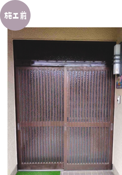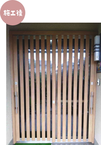 カバー工法により工事の工程や時間が格段に短くなりました。約1日で工事完了。 玄関引戸本体の傷みや、動きが悪い、重いなど、お気づきの点がありましたら お気軽にご相談ください。
